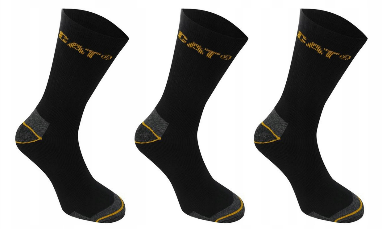 Wytrzymałe skarpety robocze marki CAT. Skarpety mają solidną cholewkę i wzmocnienia na palcach i piętach z materiału Cordura, który zapewnia dodatkową ochronę stóp podczas pracy!